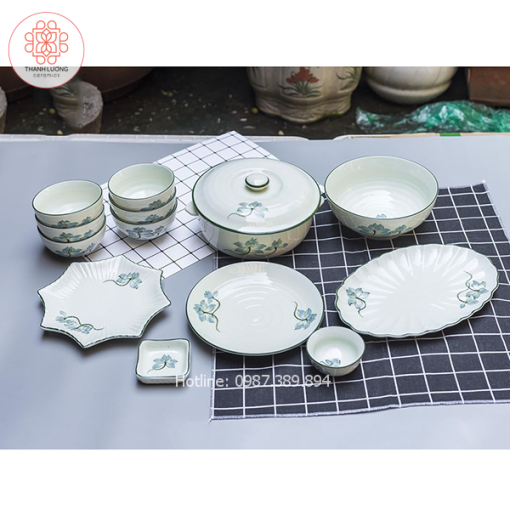 Bộ Bát Đĩa Sứ Bát Tràng Sen Xanh – 6175