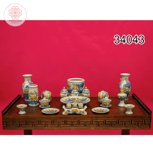 Sản phẩm bao gồm | 1 Bát hương, 1 chân bát hương, 3 Chóe S3 cao 16cm, 1 Mâm bồng, 1 Kỷ 3 ngai, 2 Bát sâm, 6 Bát cúng, 1 Ống hương S2, 1 Đèn S2, 2 Chân nến S2, 2 Lọ lộc bình 26, 2 Đĩa |
